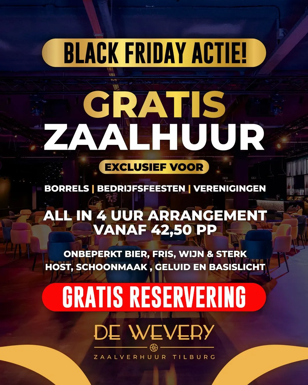 De Wevery is een multifunctionele evenementenlocatie van ruim 1000m² midden in het bruisende hart van Tilburg. De locatie is volledig uitgerust met professionele licht- en geluidsinstallaties, twee volwaardige bars, een horecakeuken van 100m² en een ruime backstage.